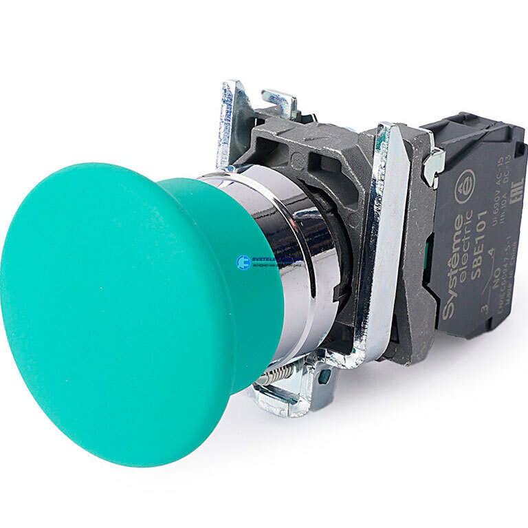 Кнопка с гриб головкой в сборе 22мм 40мм зеленая с возвратом металл 1НО, код SB4BC31, производитель Systeme Electric