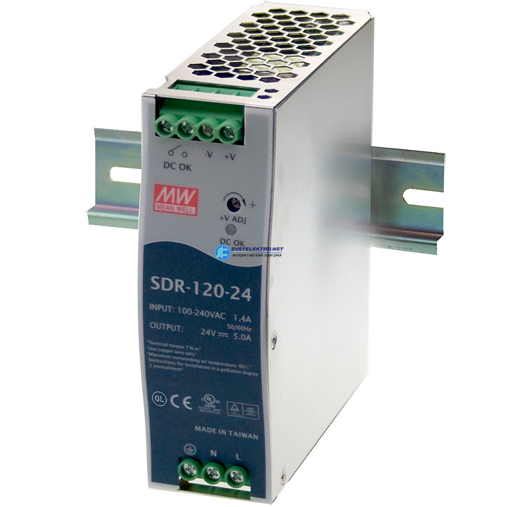 Блок питания AC-DC, 120Вт, вход 88-264V AC, 47-63Гц,124-370В DC, выход 48В,2.5A (пиковый 3.75А), рег. вых 48-55В, в кожухе на DIN-рейку, код SDR-120-48, производитель Mean Well