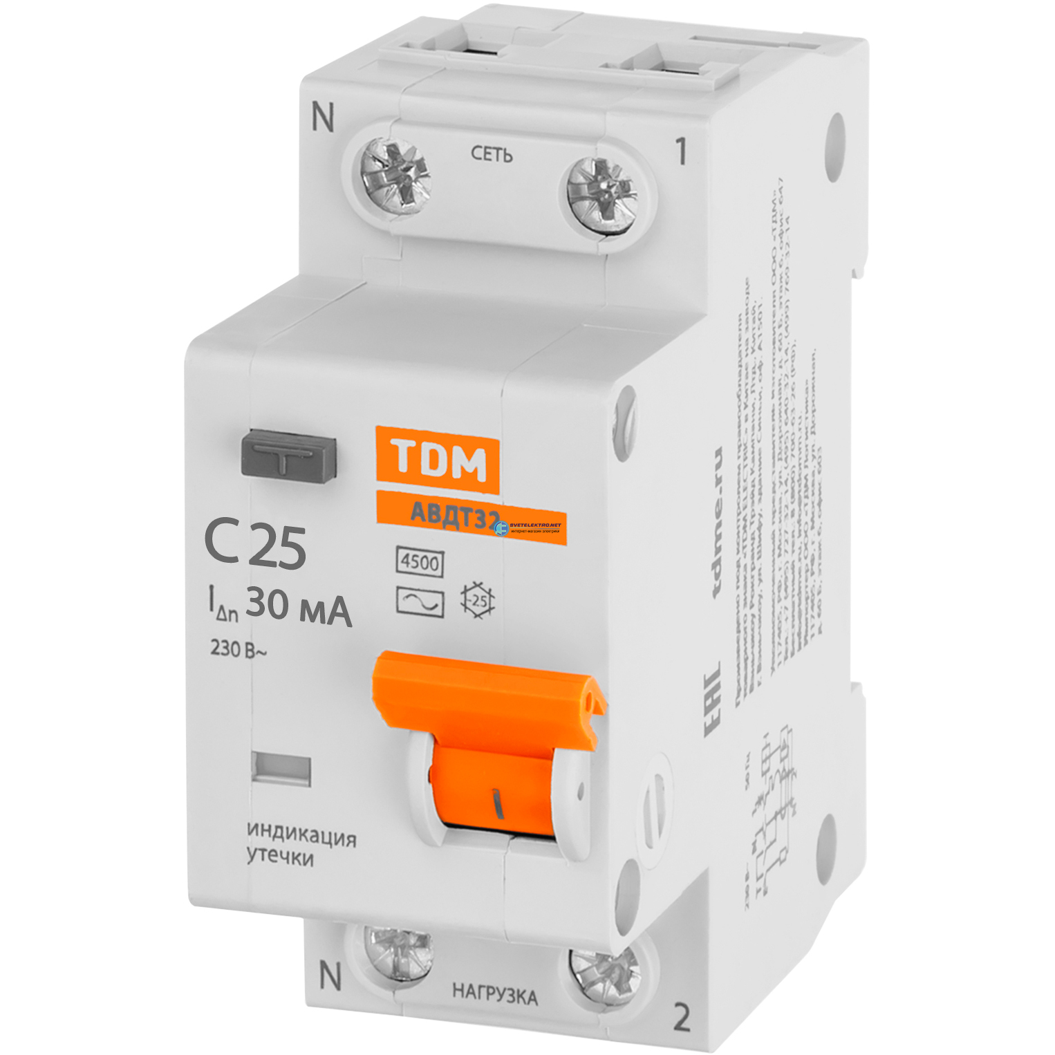 Выключатель автоматический дифференциального тока АВДТ 32 2P(1P+N) C25 30мА 4,5кА тип АС, код SQ0202-0505, производитель TDM