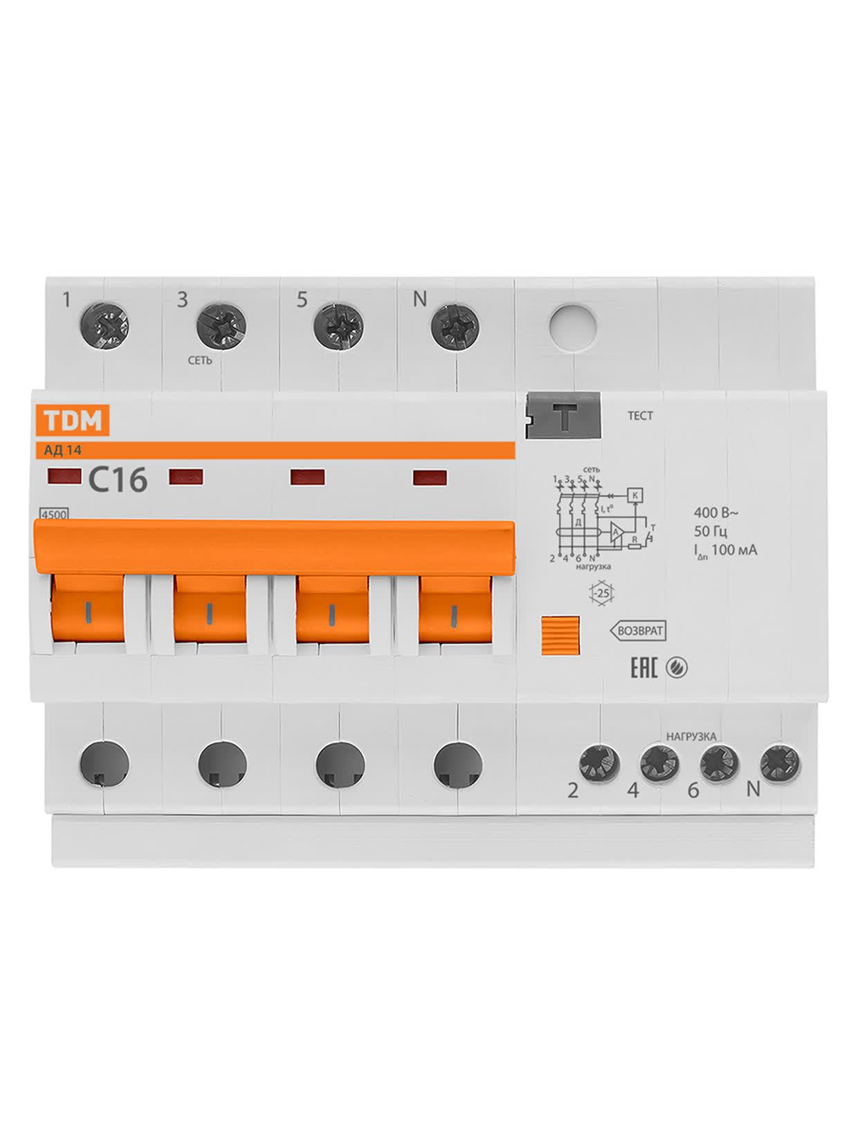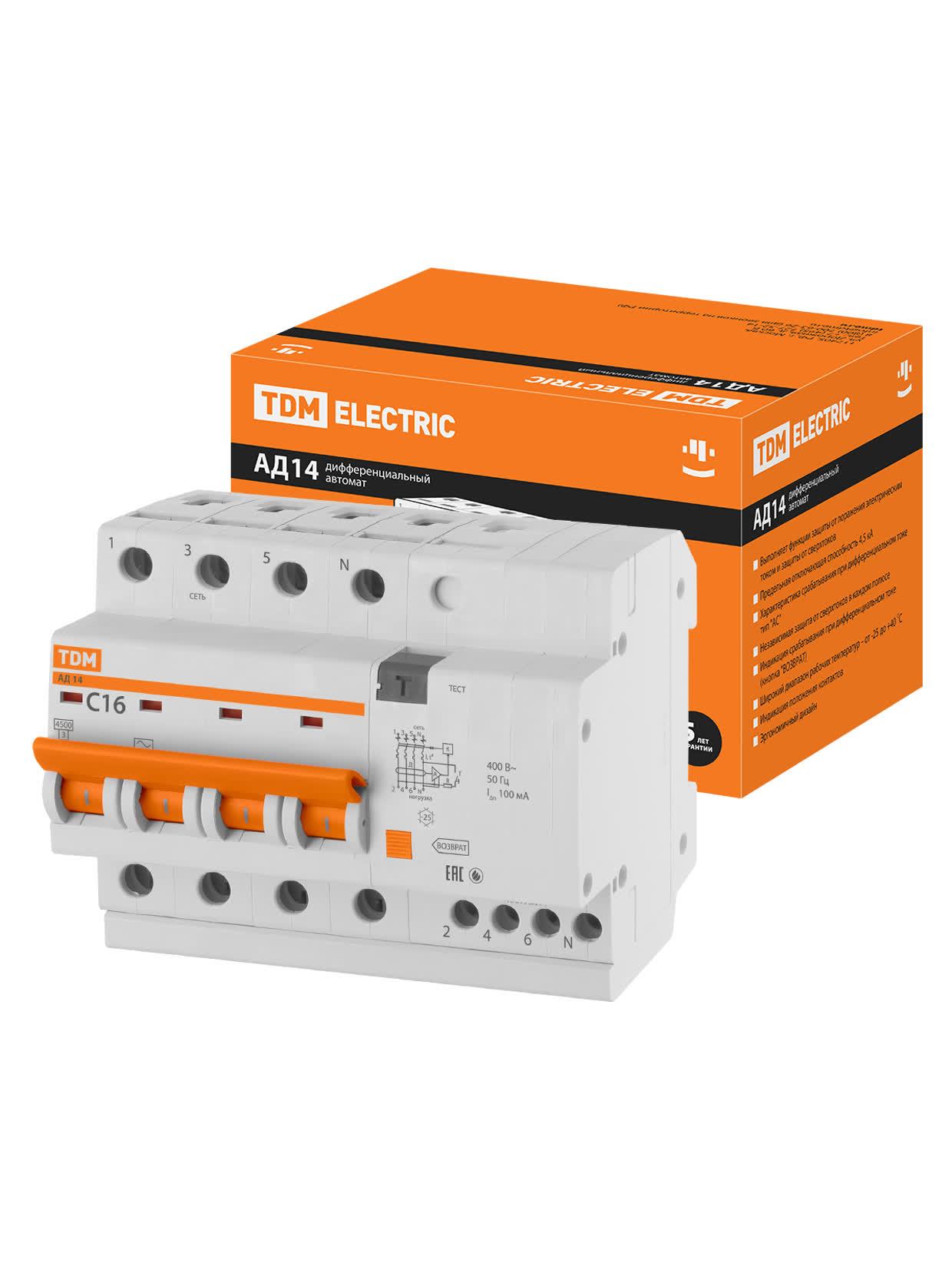 Выключатель автоматический дифференциального тока АД14 четырехполюсной 16А 100мА, код SQ0204-0031, производитель TDM