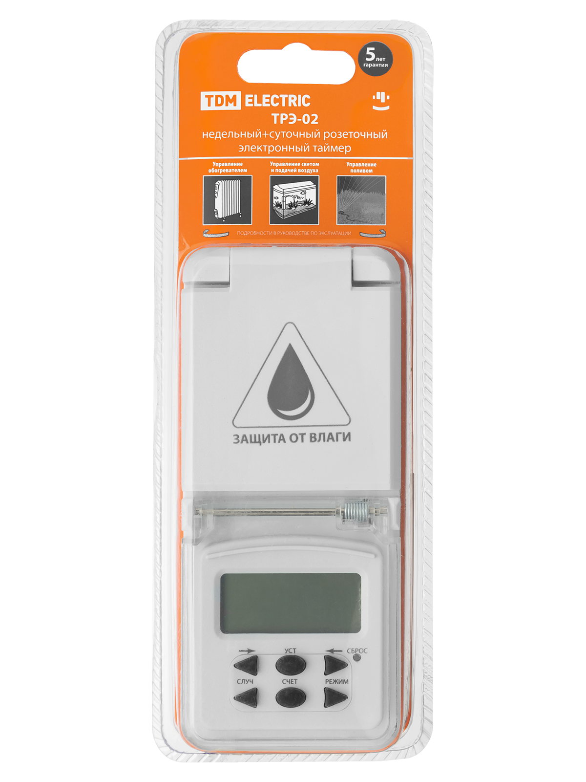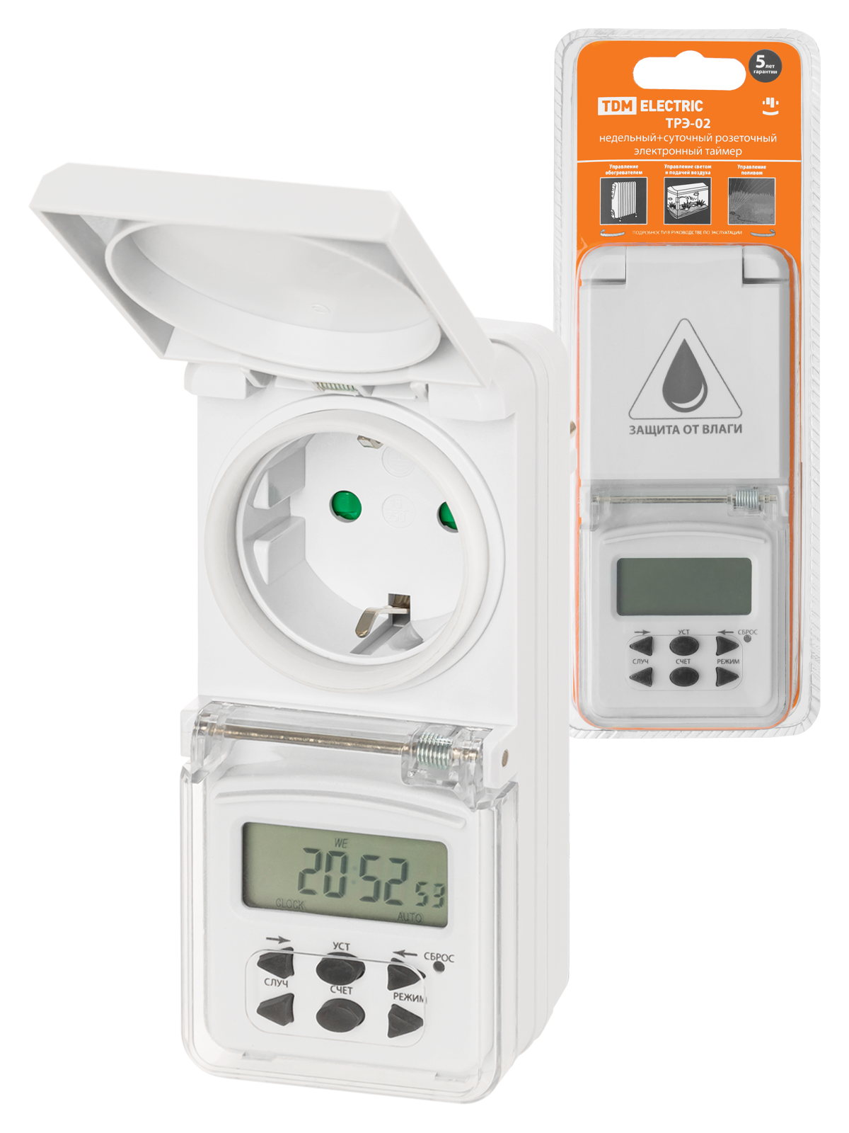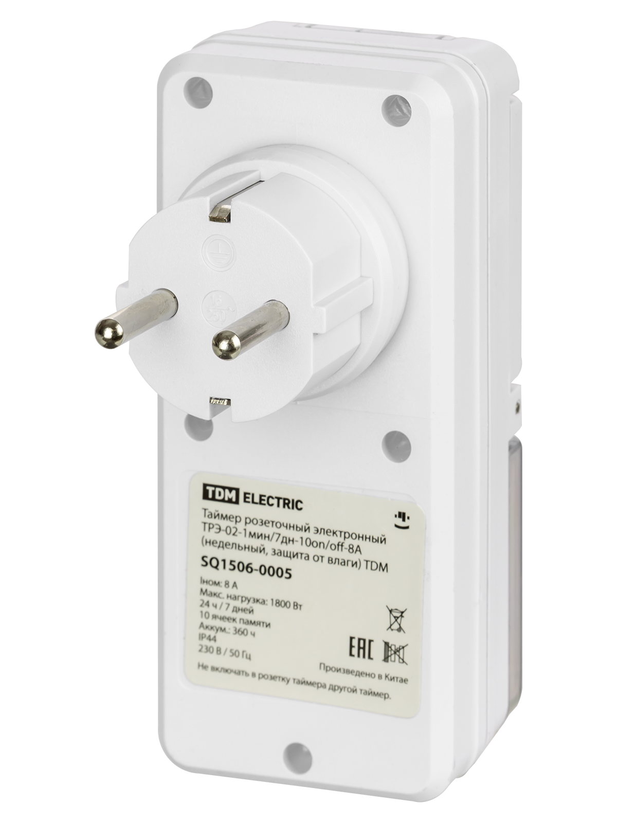 Таймер розеточный ТРЭ-02 1мин/7дн 10on/off 8А IP44 недельный защита от влаги, код SQ1506-0005, производитель TDM