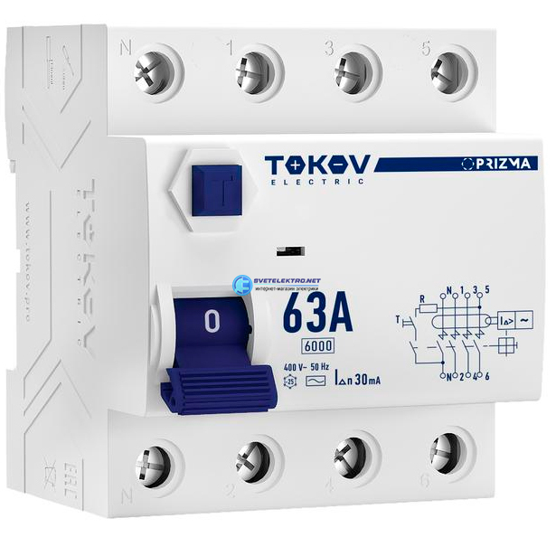 Выключатель дифференциального тока (УЗО) 4п (3P+N) 63А 30мА тип 6кА PRIZMA, код TKE-PZ60-RCDM-4-63-30-AC, производитель TOKOV ELECTRIC