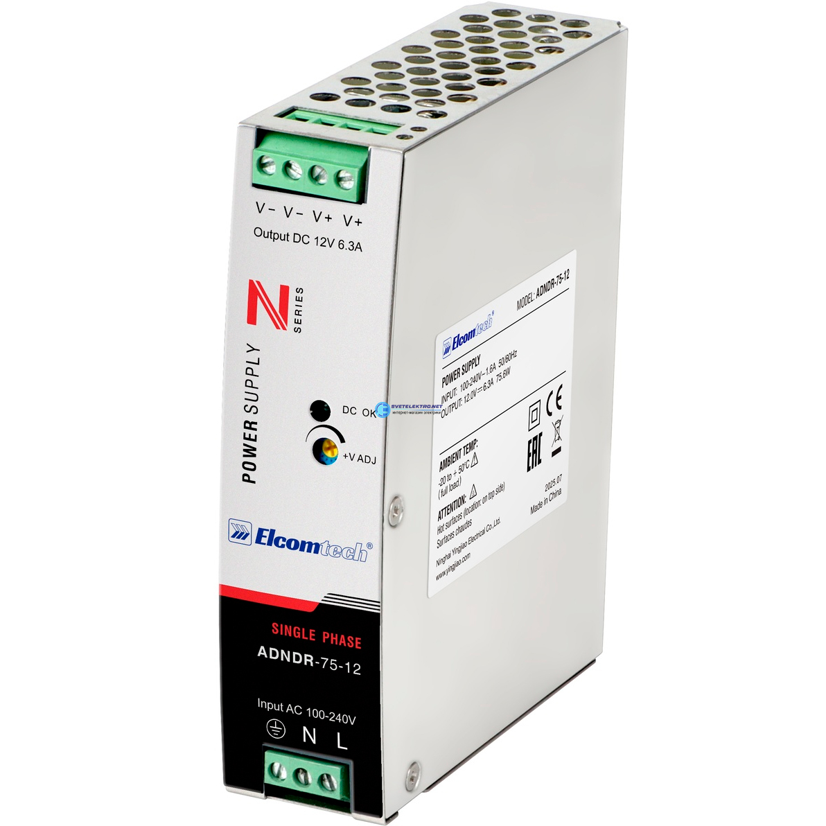 Источник питания на DIN рейку AC/DC 75,6W вход 100-240V,выход 12V 6,3A ADNDR-75-12, код УТ-00035155, производитель Elcomtech