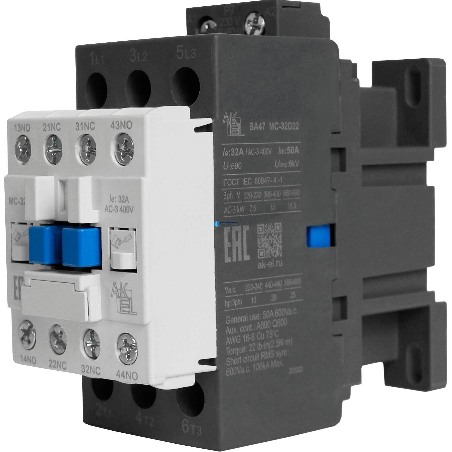 Контактор магнитный BA47 MC-32D22P7 3P 2NO+2NC/32A/230VAC, код УТ000414101, производитель АКЭЛ
