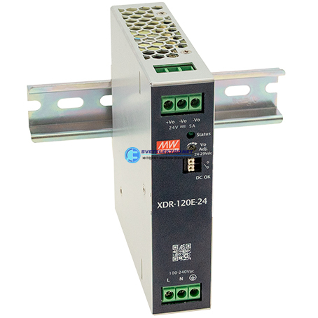 AC-DC, 120Вт, вх.85…264V AC, 47…63Гц /120…370В DC, вых.24В/5A (пиковый 6.5А), рег. вых 24...29В, изол.3000В AC, DC OK, в кожухе на DIN-рейку 30х125,2х XDR-120E-24 Mean Well
