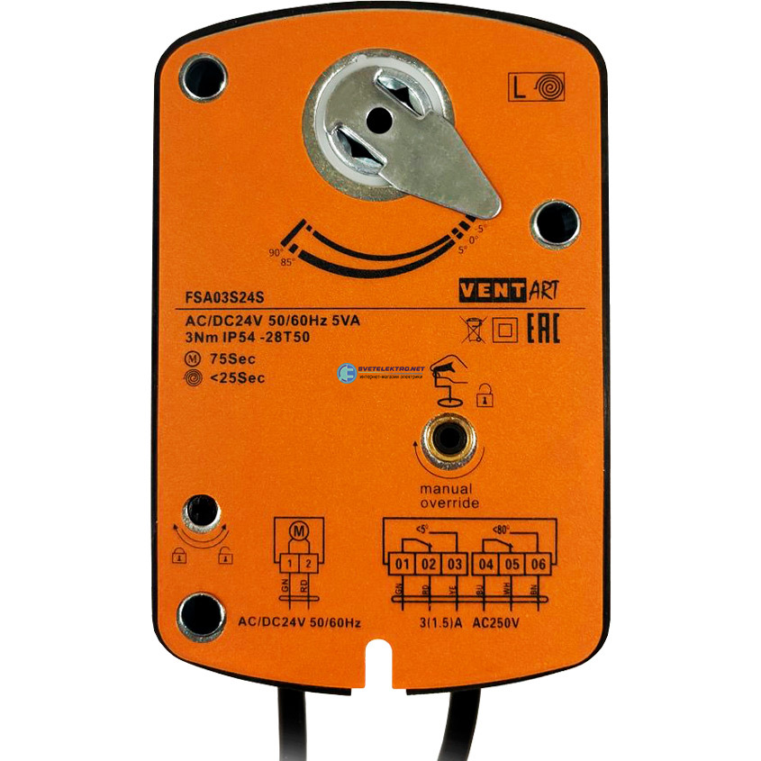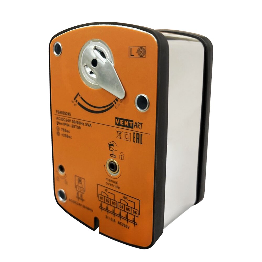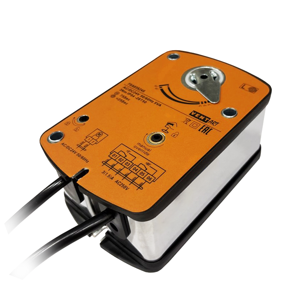 Электропривод ON/OFF, с возвратной пружиной для противопожарных клапанов с 2-я переключателями FSA03S24S, код 4687203905767, производитель VentART