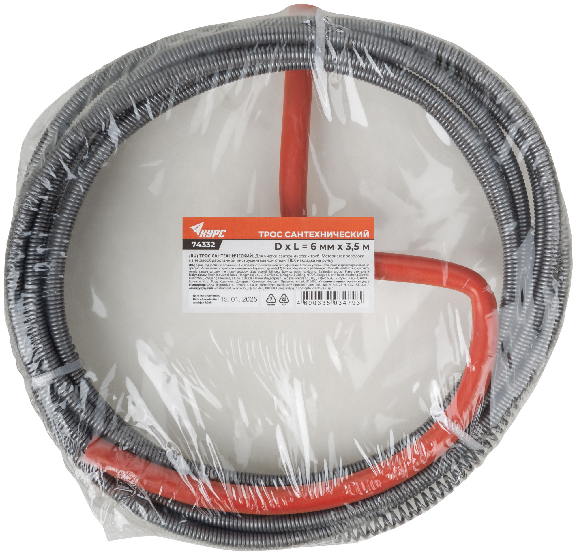 Трос сантехнический для чистки труб 3,5 м x 6,0 мм, код 74332, производитель Курс