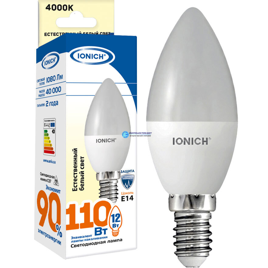 Лампа светодиодная Е14 12вт 4000К 1080Лм C37 свеча, код 1640, производитель IONICH