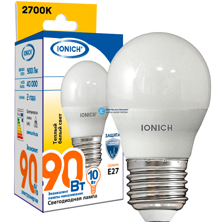 Лампа светодиодная Е27 10вт 2700К 900Лм G45 декоративного освещения шар, код 1802, производитель IONICH