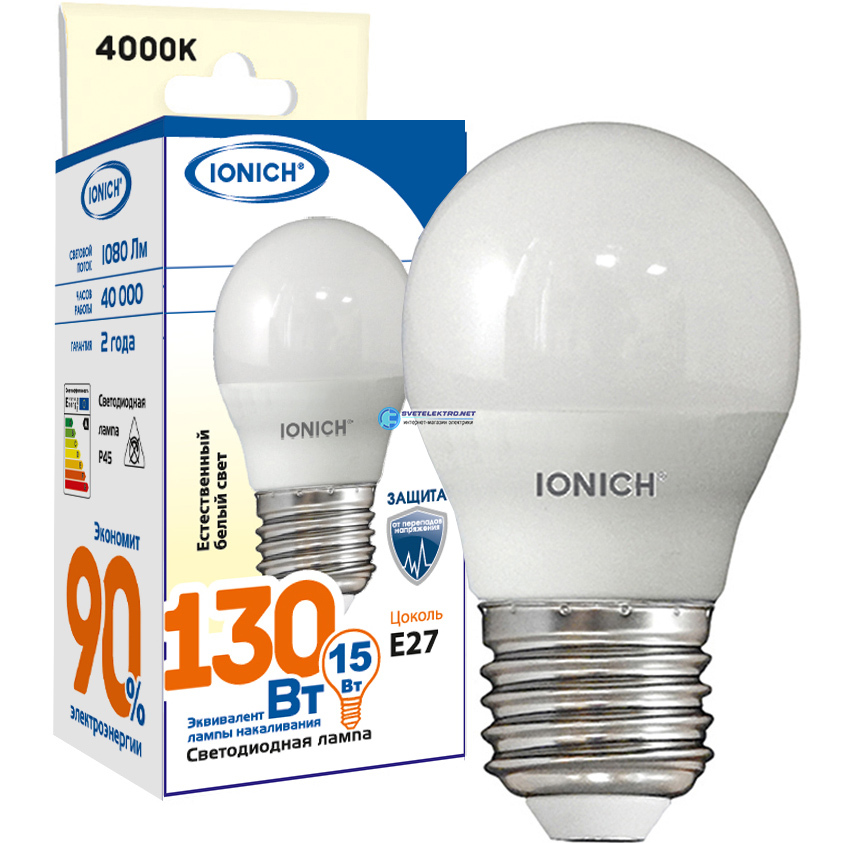 Лампа светодиодная Е27 15вт 4000К 1350Лм G45 декоративного освещения шар, код 1825, производитель IONICH