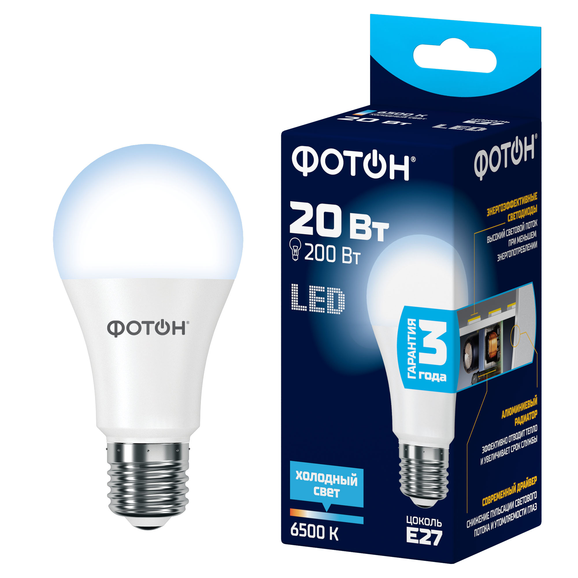 Лампа светодиодная E27 20Вт 6500K 1725Лм A60, код 23395, производитель ФОТОН