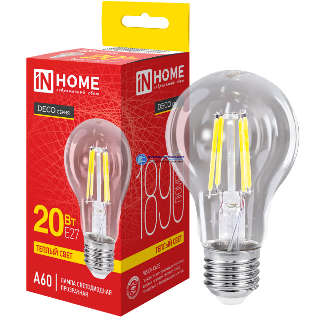 Лампа светодиодная LED-A60-deco 20Вт 230В Е27 3000К 1890Лм прозрачная IN HOME 4690612063171 IN HOME