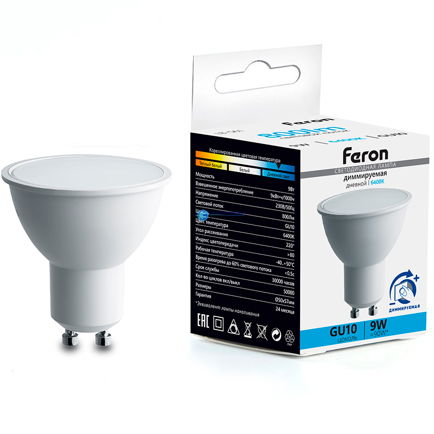 Лампа светодиодная GU10 9вт 6400К 800Лм 230в диммируемая LB-561, код 51063, производитель FERON