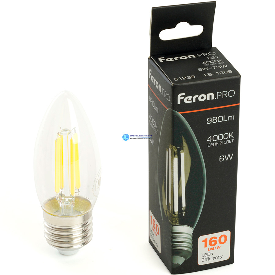 Лампа светодиодная Е27 6вт 4000К 980Лм свеча FILAMENT PRO LB 1206, код 51239, производитель FERON