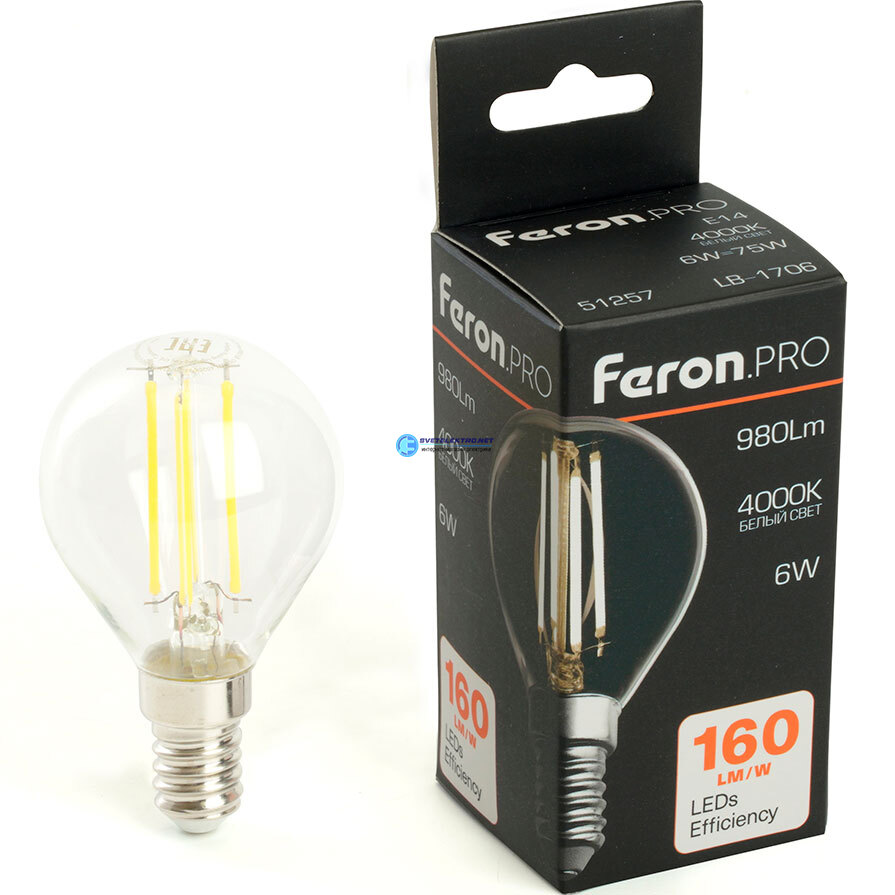 Лампа светодиодная Е14 6вт 4000К 980Лм шар FILAMENT PRO LB-1706, код 51257, производитель FERON