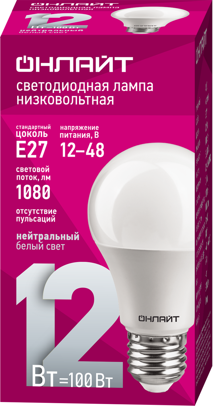 Лампа светодиодная E27 12вт 12/48в 4000К 1080Лм A60 OLL, код 90876, производитель ОНЛАЙТ