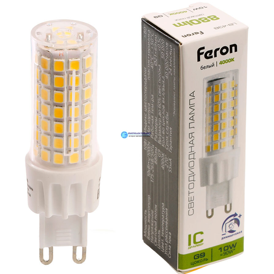 Лампа светодиодная G9 10вт 4000К 880Лм 230в белый капсульная диммируемая LB-438, код 51742, производитель FERON
