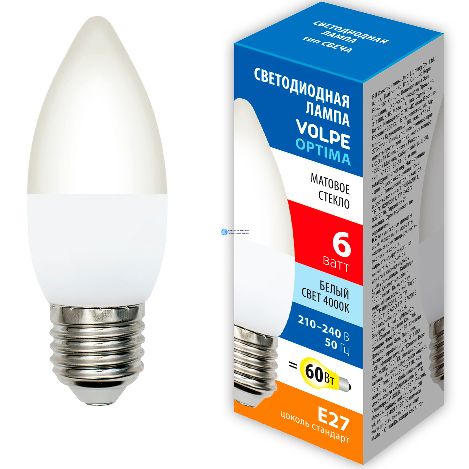 Лампа светодиодная Е27 6вт 4000К 600Лм C37 "свеча" матовая FR SLS, код UL-00008789, производитель Uniel