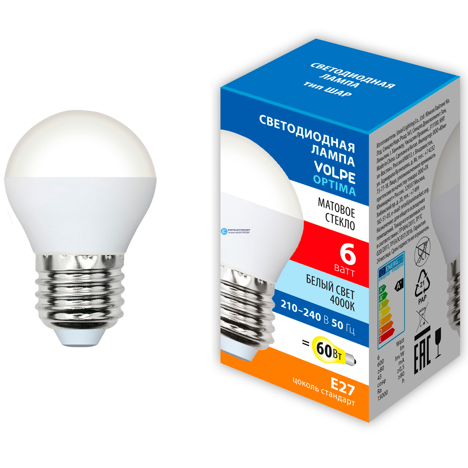 Лампа светодиодная Е27 6вт 4000К 600Лм G45 шар матовый FR SLS, код UL-00008806, производитель Uniel