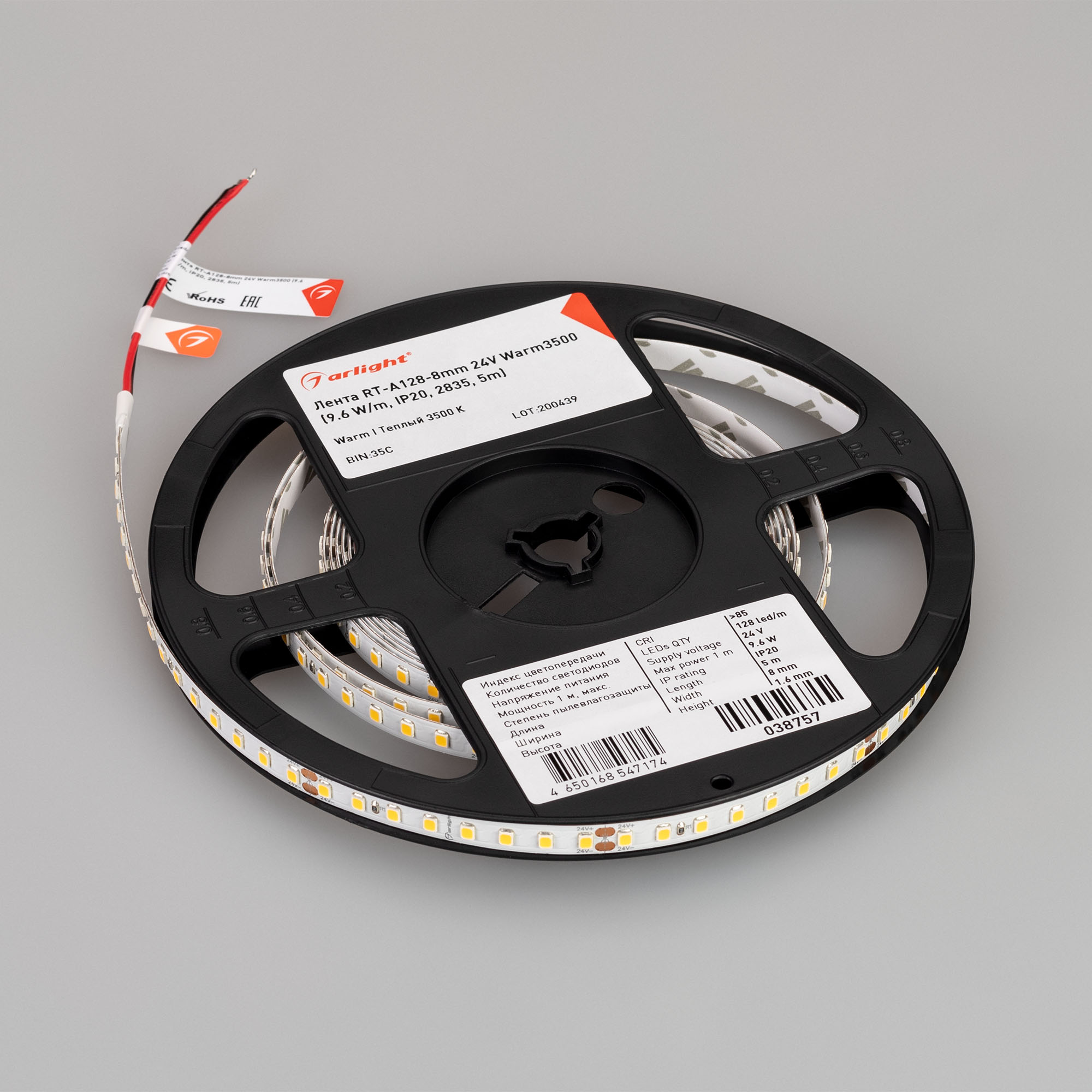 Лента светодиодная RT-A128-8mm 24V Warm3500 (10 W/m, IP20, 5m) высокая эффективность 150 лм/Вт, 128 LED/m), код 038757(1), производитель Arlight