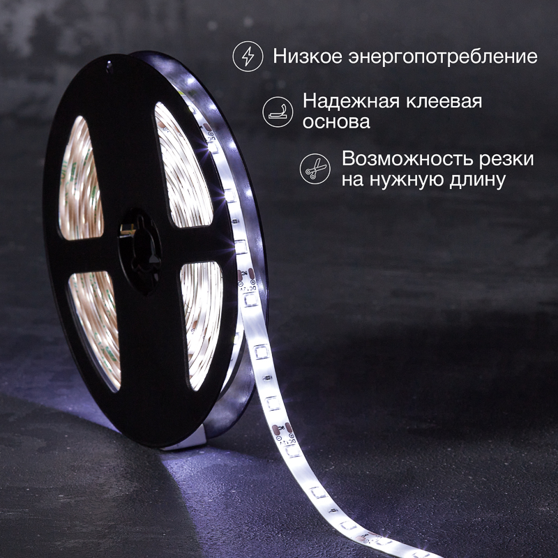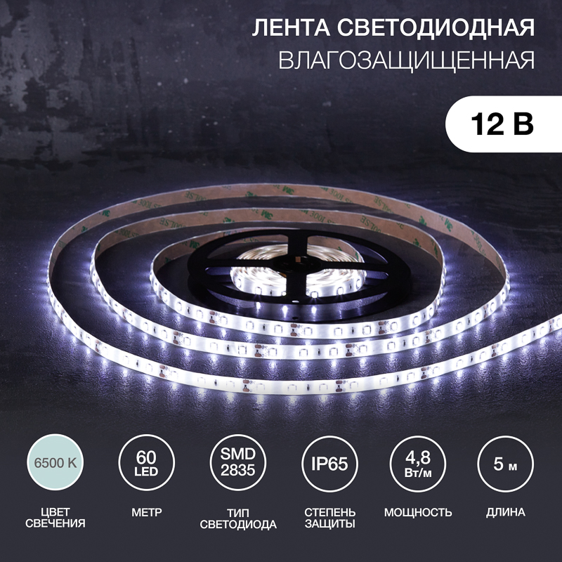 Лента светодиодная 5 м 12 В 2835 6500 К IP65 60 LED/м для БП с клеммами LAMPER 141-2015 REXANT