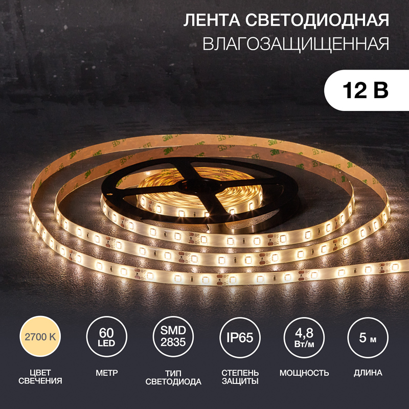 Лента светодиодная 5 м 12 В 2835 2700 К IP65 60 LED/м для БП с клеммами LAMPER 141-2016 REXANT