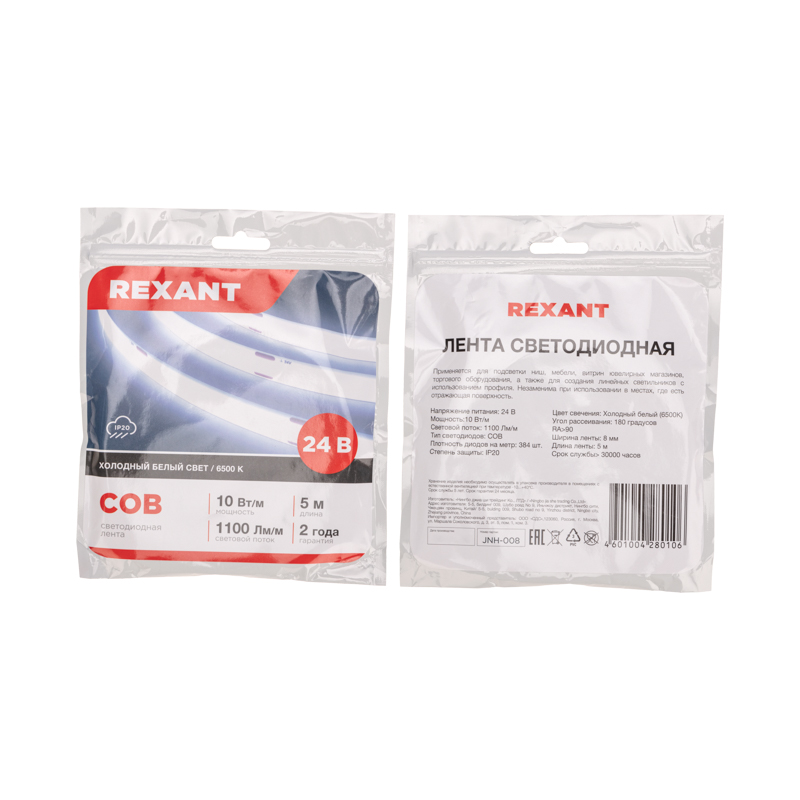 Лента светодиодная 24В COB 10Вт/м 384LED/м 6500K 8мм 5м IP20, код 147-102, производитель REXANT
