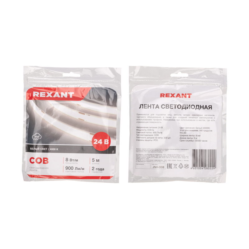 Лента светодиодная 24В COB 8Вт/м 320LED/м 4000K 8мм 5м IP20, код 147-111, производитель REXANT