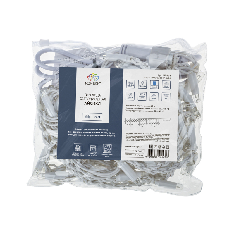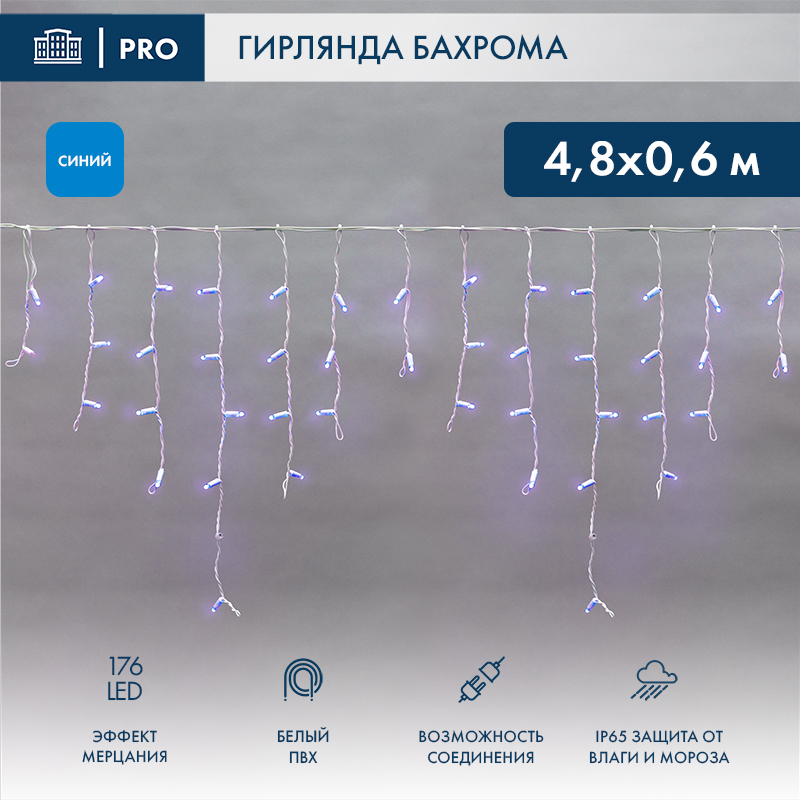 Гирлянда Айсикл 4,8х0,6 м, с эффектом мерцания, белый ПВХ, 176LED, Синий, 230В, код 255-163, производитель Neon-Night