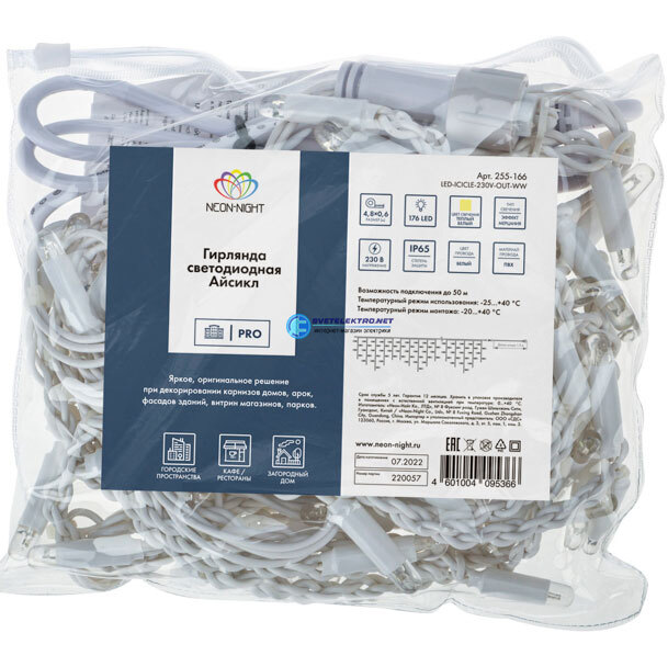 Гирлянда Айсикл 4,8х0,6 м, с эффектом мерцания, белый ПВХ, 176LED, тёплый белый, 230В, код 255-166, производитель Neon-Night