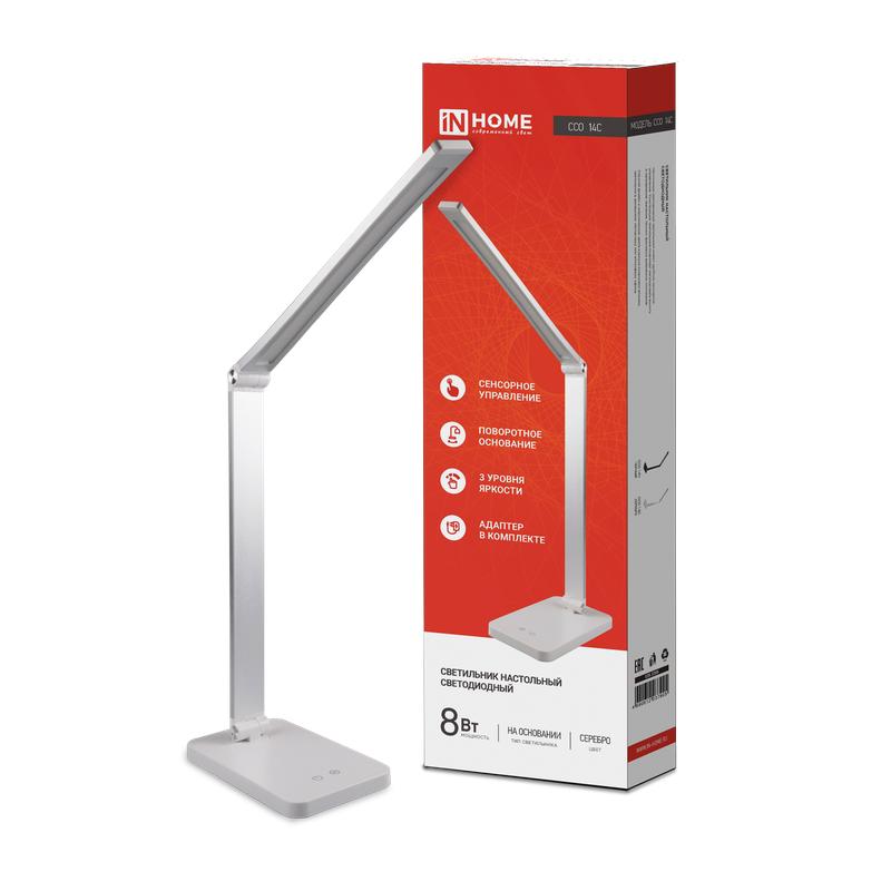 Светильник настольный светодиодный PLUS ССО-14С 8Вт 480Лм, сенсор, адаптер СЕРЕБРО IN HOME 4690612037905 IN HOME