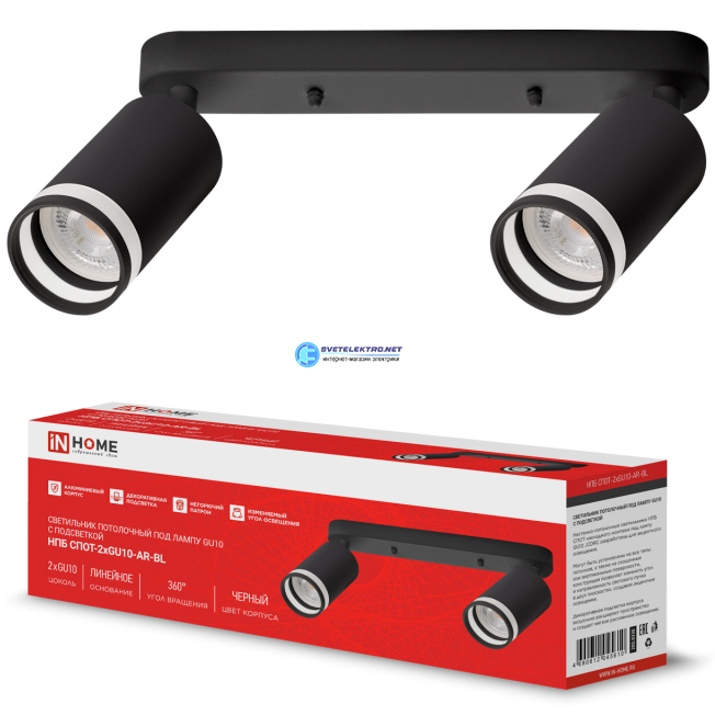 Светильник потолочный НПБ СПОТ-2xGU10-AR-BL под лампу GU10 260х55х135мм линейный черный IN HOME 4690612045610 IN HOME