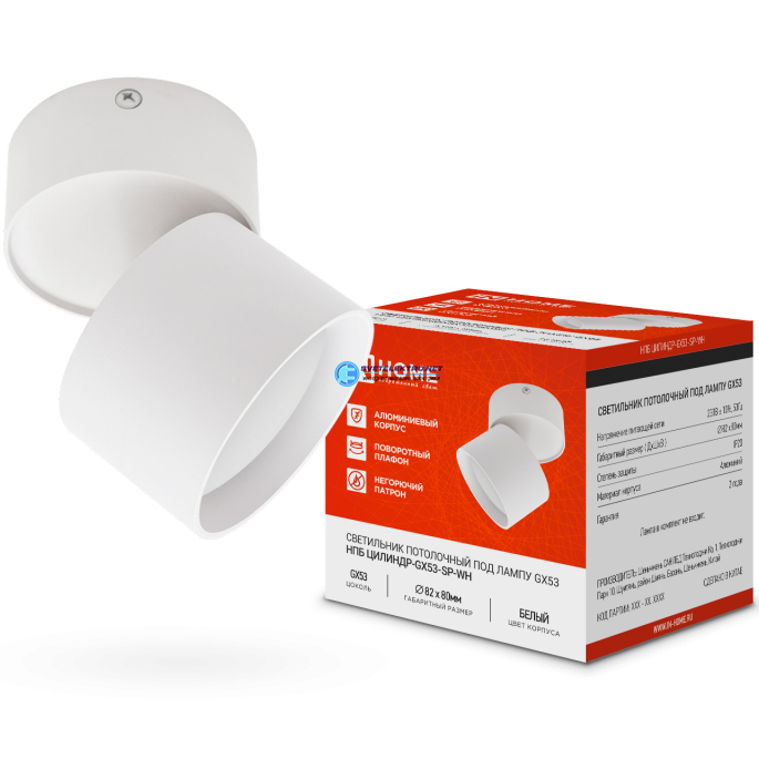 Светильник потолочный НПБ ЦИЛИНДР-GX53-SP-WH под лампу GX53 80х80мм белый, код 4690612046303, производитель IN HOME