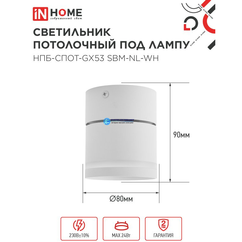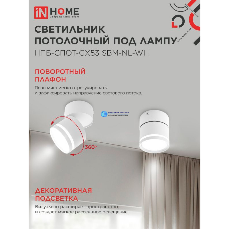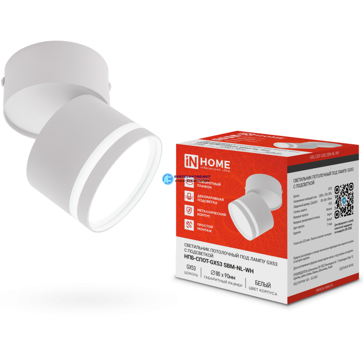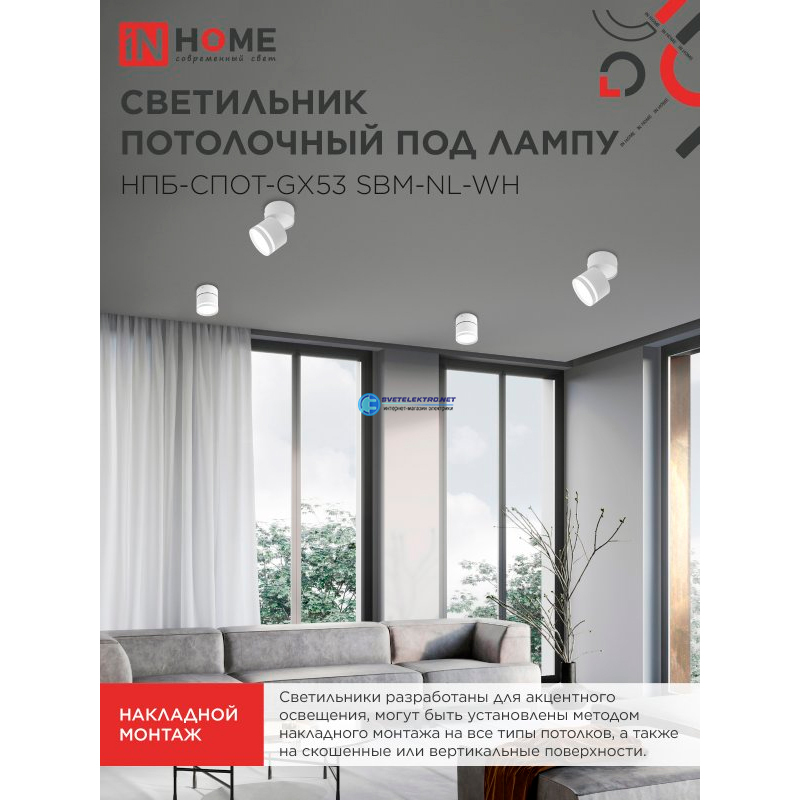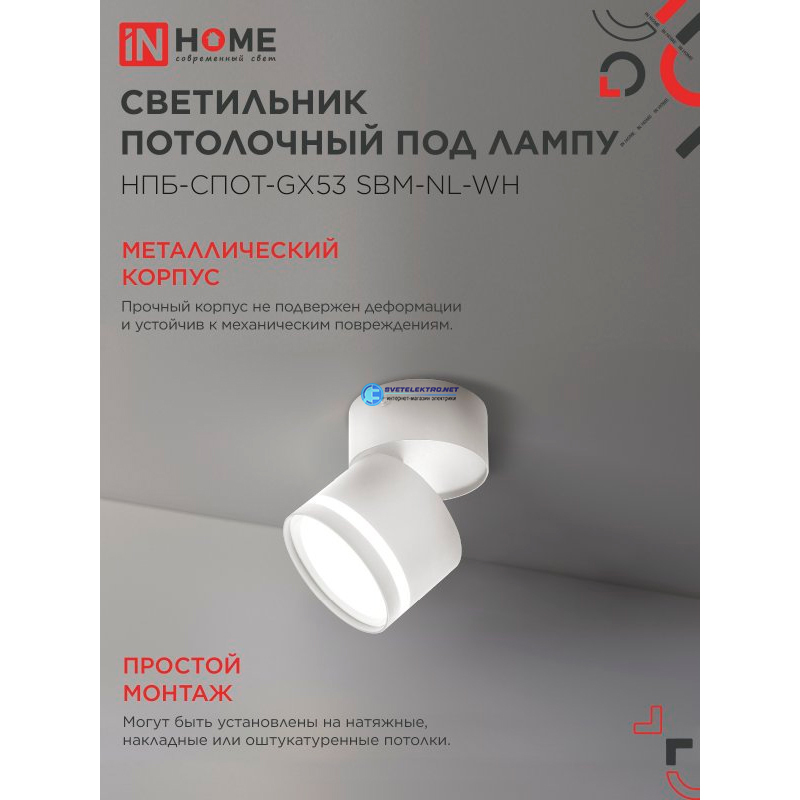 Светильник потолочный НПБ СПОТ-GX53-NL-WH под лампу GX53 82х80мм белый, код 4690612052243, производитель IN HOME