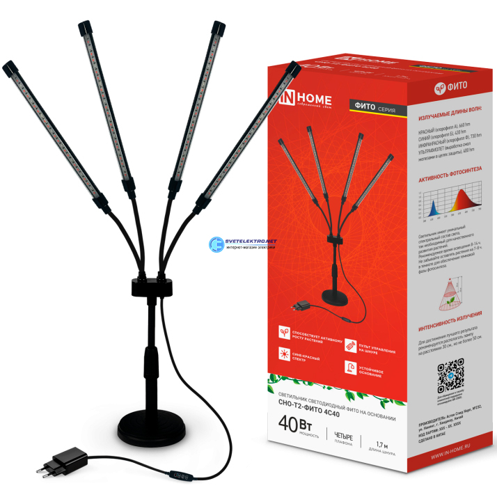 Светильник настольный на основании светодиодный СНО-Т2-ФИТО 4С40 40Вт 4 плафона, пульт на шнуре ЧЕРНЫЙ IN HOME 4690612053561 IN HOME