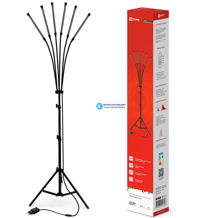 Светильник напольный на треноге светодиодный ТНО-Т2-ФИТО 6Т60 60Вт 6 плафонов, пульт на шнуре ЧЕРНЫЙ IN HOME 4690612053578 IN HOME
