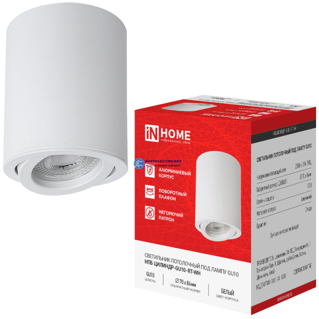 Светильник потолочный НПБ ЦИЛИНДР-GU10-RT-WH алюминиевый поворотный под лампу GU10 230B 70х84мм белый, код 4690612053639, производитель IN HOME