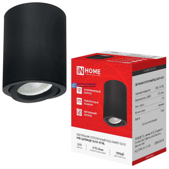 Светильник потолочный НПБ ЦИЛИНДР-GU10-RT-BL алюминиевый поворотный под лампу GU10 230B 70х84мм черный, код 4690612053646, производитель IN HOME