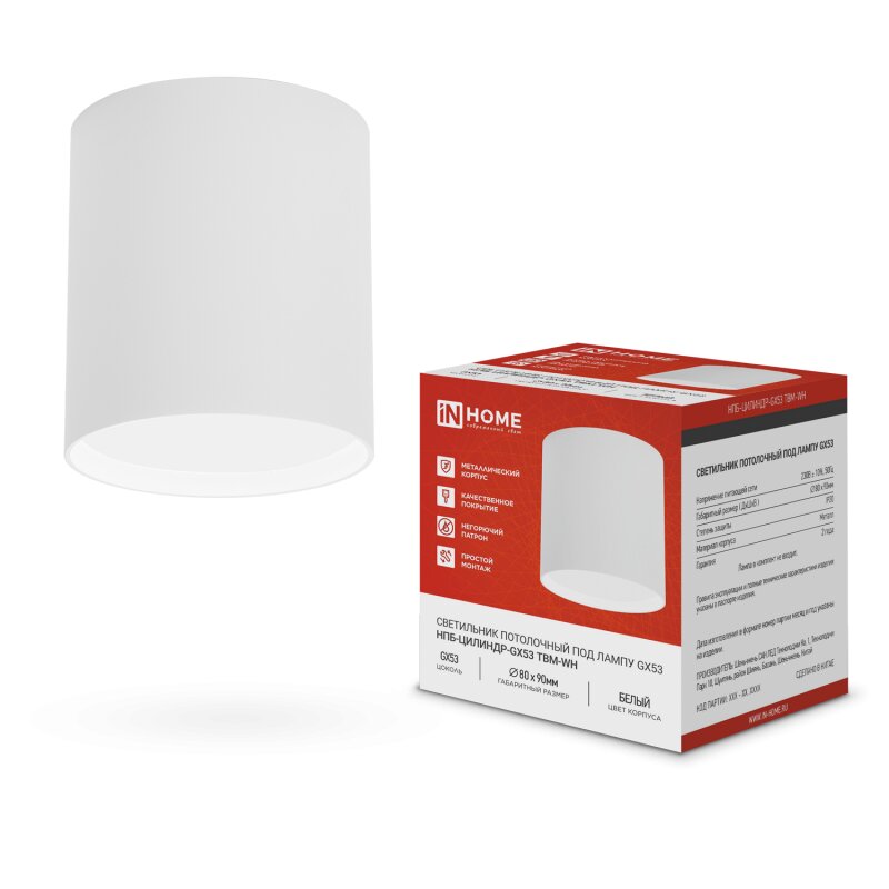 Светильник потолочный GX53 НПБ-ЦИЛИНДР TBM-WH 80х90мм белый, код 4690612056418, производитель IN HOME