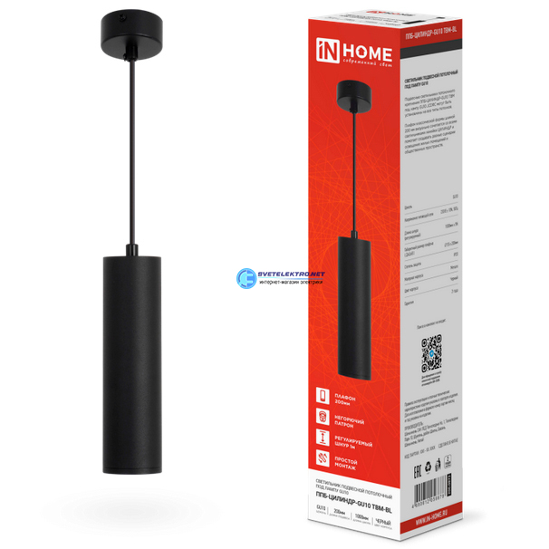 Светильник подвесной ППБ-ЦИЛИНДР-GU10 TBM-BL 200мм, шнур 1м, черный IN HOME 4690612056678 IN HOME