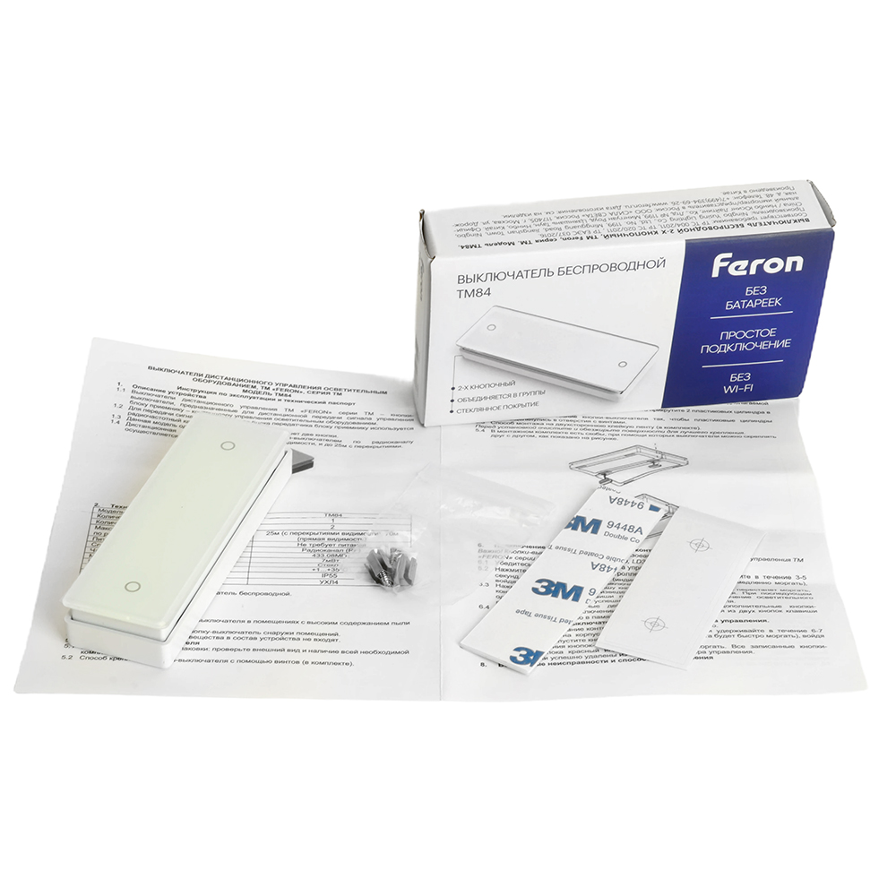 Выключатель беспроводной одноклавишный двухкнопочный стекло белый, код 48877, производитель FERON
