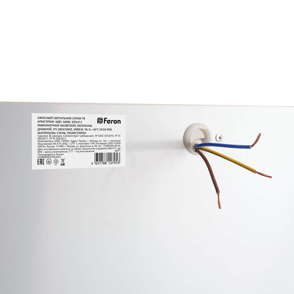 Светильник светодиодный ДВО-40вт 595х595х40 5000К 3400Лм матовый с равномерной засветкой TR Армстронг, код 48911, производитель FERON
