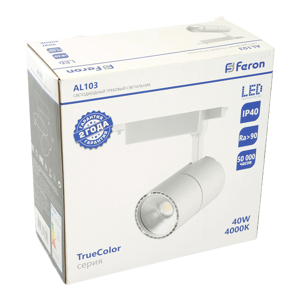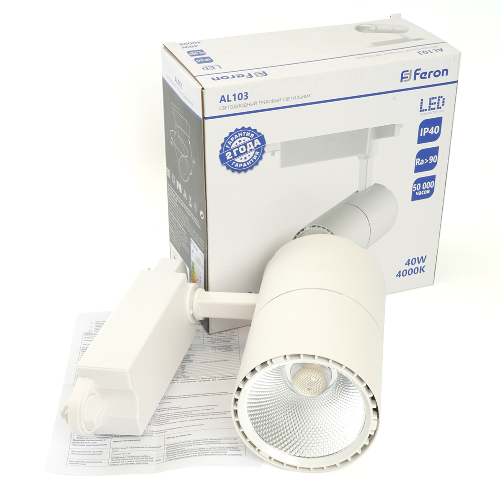 Светильник светодиодный трековый на шинопровод ДПО-40w 4000К 3600Лм белый, код 48943, производитель FERON