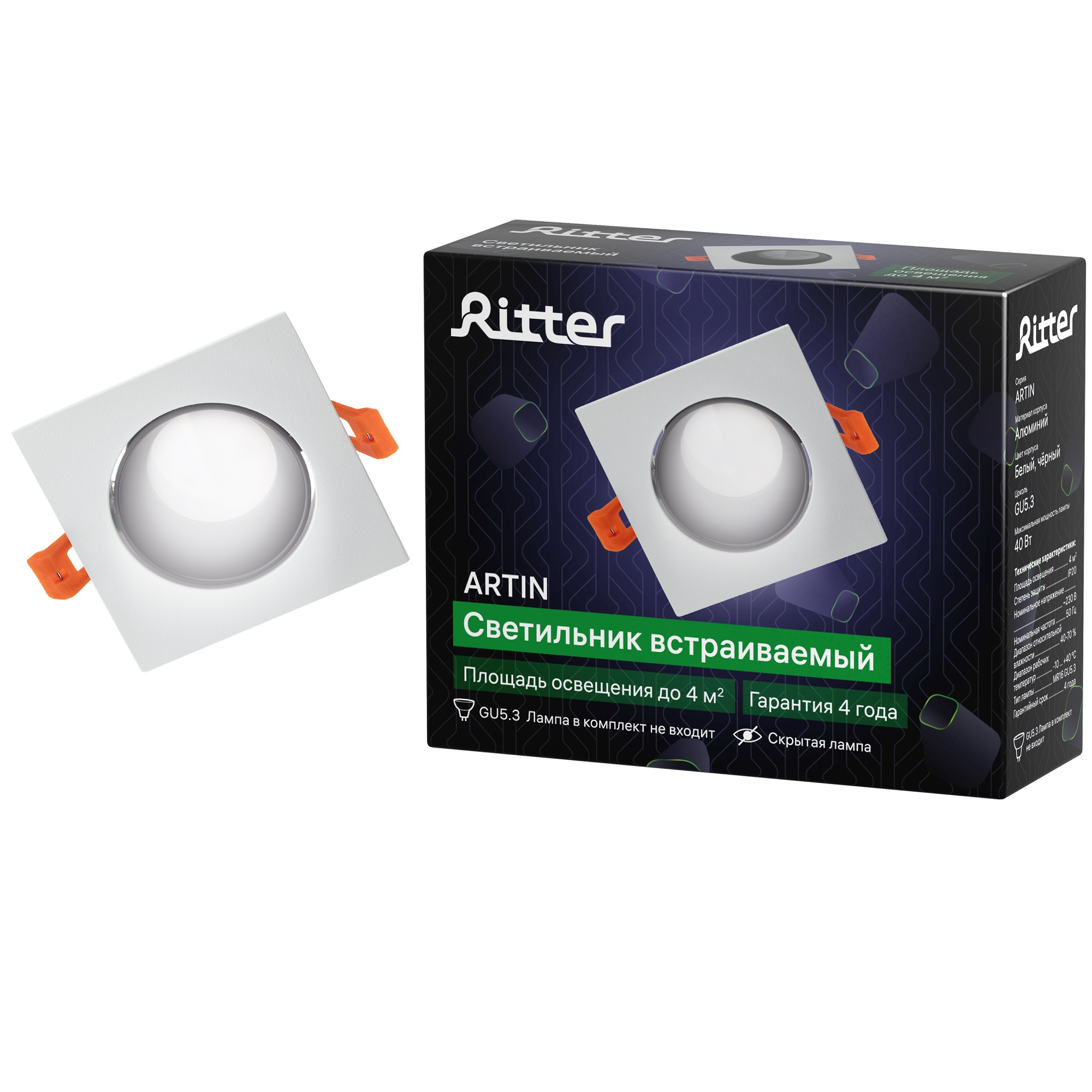 Светильник встраиваемый, ARTIN, скрытая лампа, квадрат, 90х90х30мм, монтажное отверстие 75х75мм, GU5.3, алюминий, белый, ,, код 51430 5, производитель RITTER