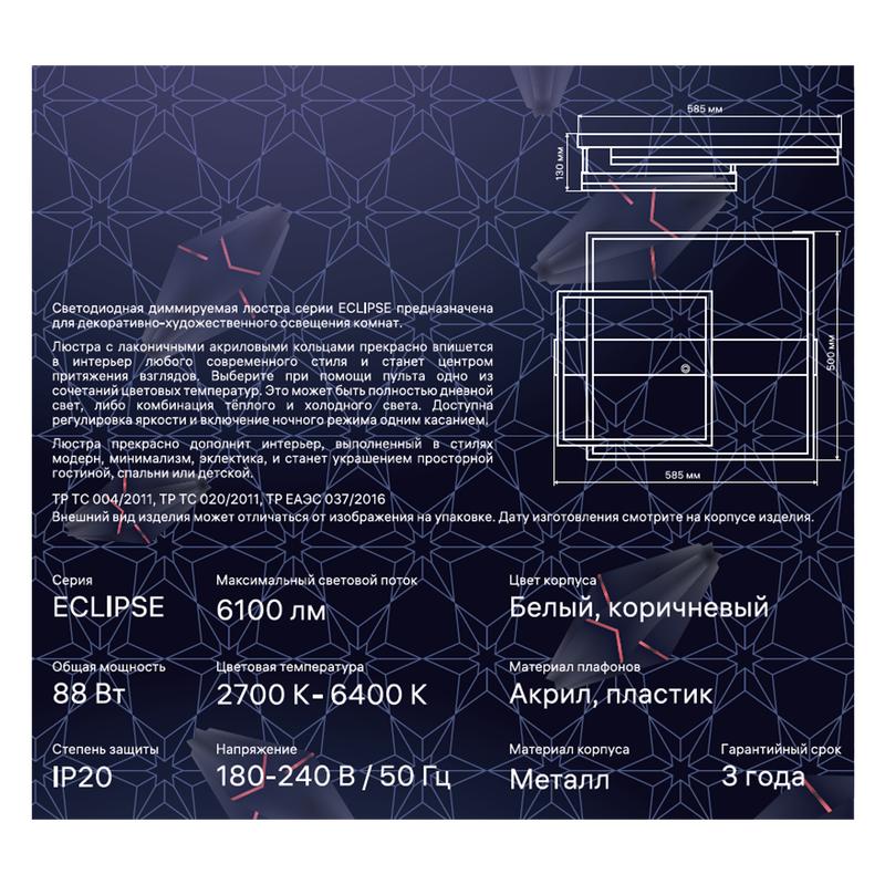 Люстра потолочная светодиодная диммируемая, ECLIPSE, с ДУ, 3 режима, 585х500х130мм, 88вт, 2700К+6400К/4200К/6400К+2700К, 31м, белый/коричневый, код 52088 1, производитель RITTER