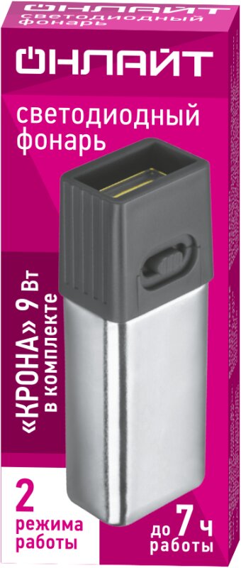 | Преимущества: | 2 режима работы - 100% и 50% яркости|Яркий COB-диод служит до 100 000 часов|Батарея ''Крона'' 6F22 обеспечивает до 7 часов автономной работы, поставляется в комплекте|Легкий компактный корпус выполнен из АБС-пластика: |