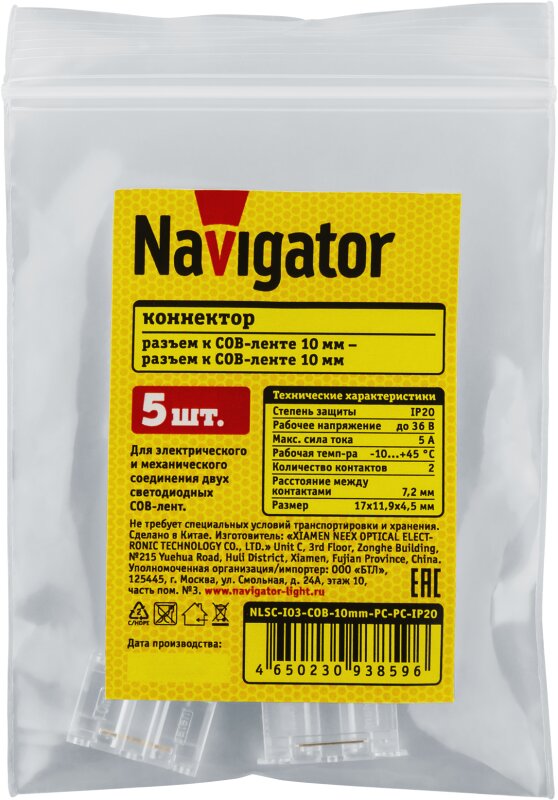 Коннектор NLSC-I03-COB-10mm-PC-PC-IP20, код 93859, производитель Navigator