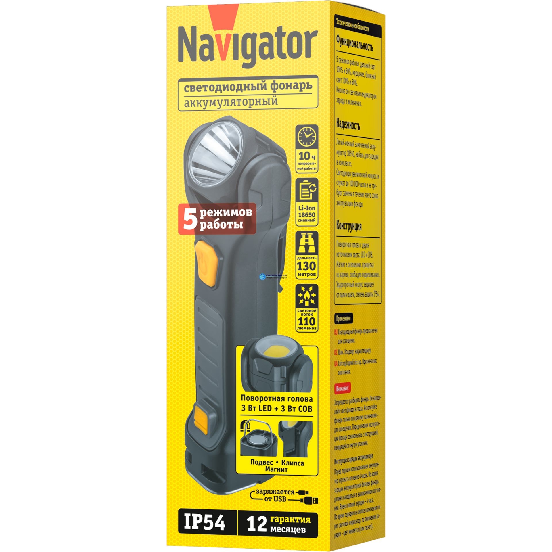 Фонарь светодиодный NPT-W18-ACCU для работы 1 LED, 3Вт + 1 COB, 3Вт, код 95559, производитель Navigator