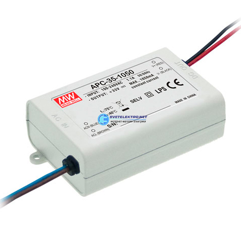 Драйвер AC-DC, 35Вт, токовый выход, вход 90-264В AC, выход 350мА,28-100В, код APC-35-350, производитель Mean Well