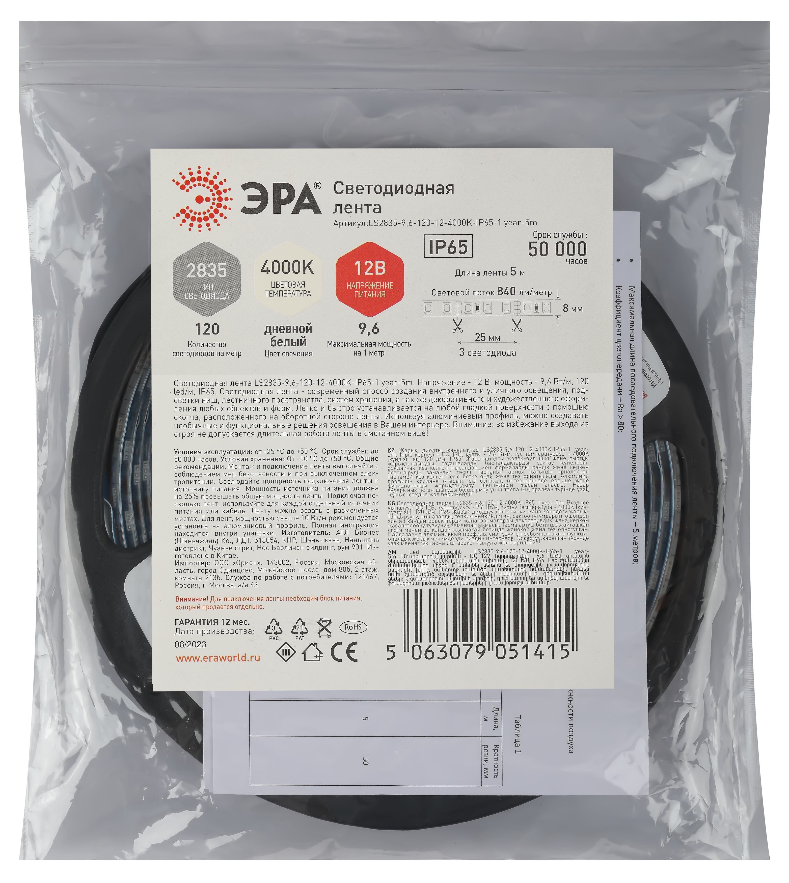 Светодиодная лента LS2835-9,6-120-12-4000K-IP65-1 year-5m дневной белый 5м, код Б0059902, производитель ЭРА